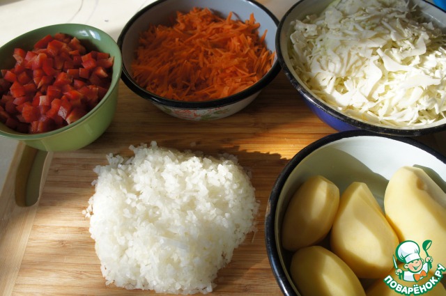 Мясо провернуть через мясорубку. Морковь и картофель очистить и натереть на крупной терке, лук измельчить, перец нарезать маленькими кусочками, капусту тонко нашинковать.