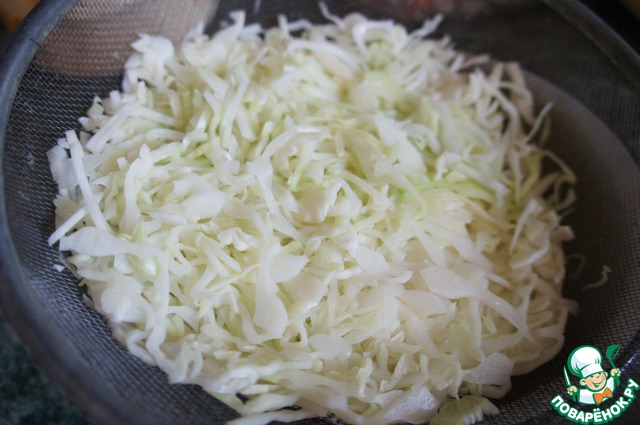 Выложить капусту в дуршлаг, обдать крутым кипятком и затем холодной водой, дать ей стечь.