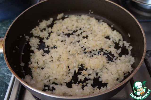 В глубоком сотейнике разогреть 3 ст. л. растительного масла, обжарить лук до легкой золотистости,