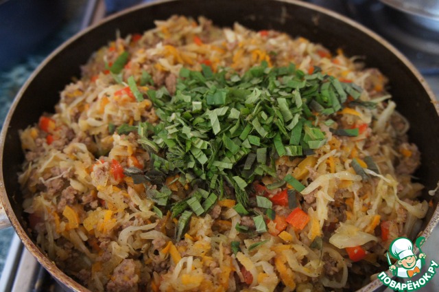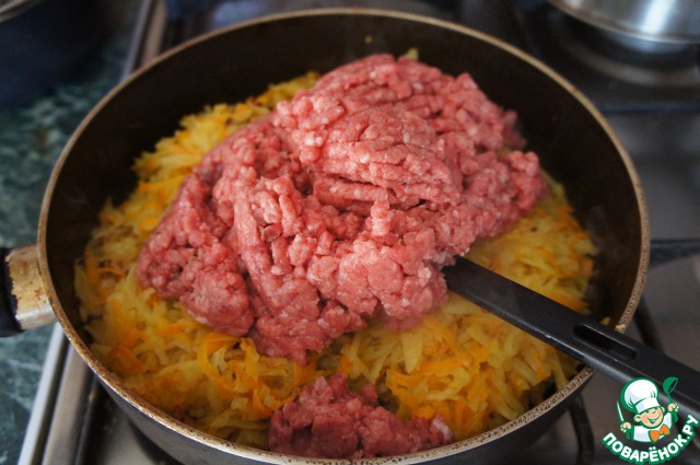 Добавить фарш, жарить все вместе 10 минут,
