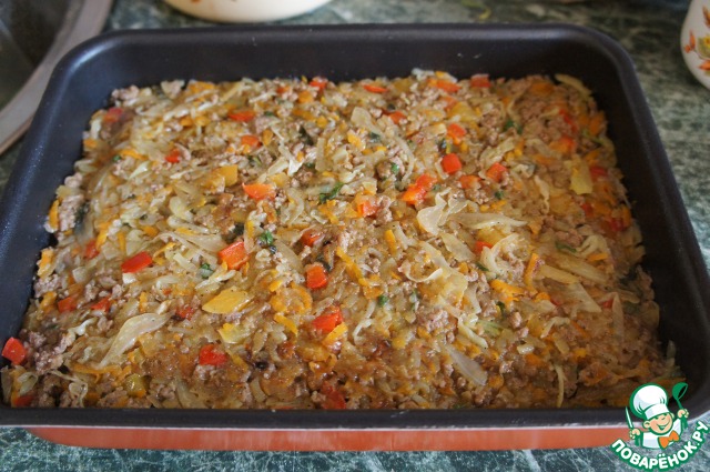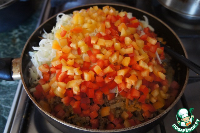 затем положить капусту и перец, посолить, поперчить и потушить еще 10 минут.