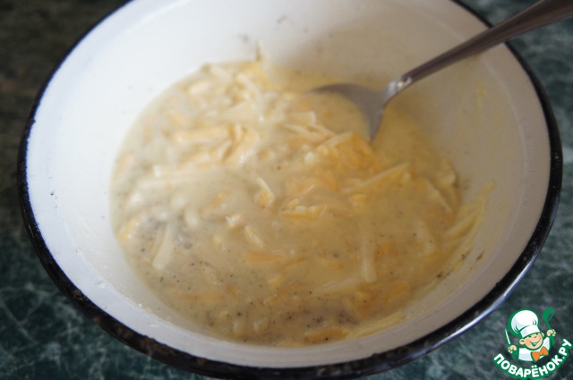 Яйца взбить со сметаной, добавить натертый на крупной терке сыр или раскрошенную брынзу и перемешать.