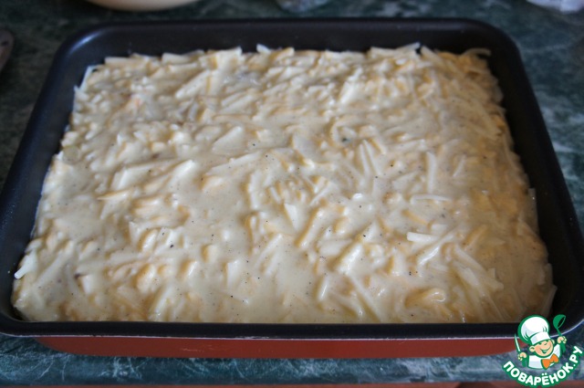 Залить запеканку и поставить в духовку.