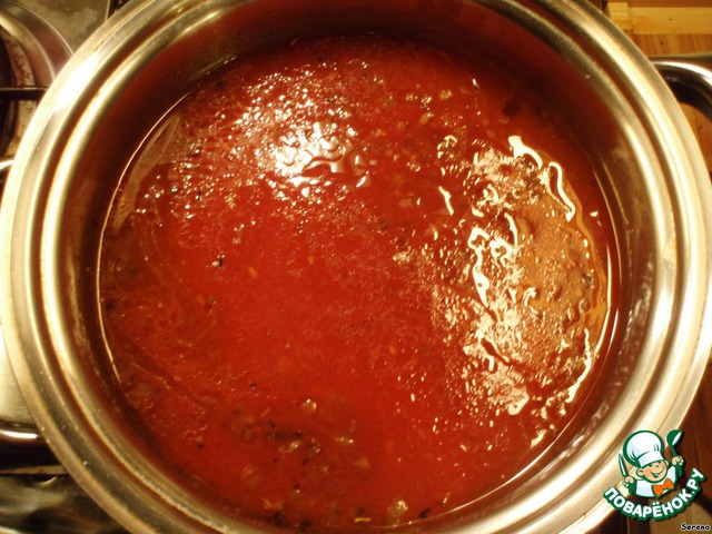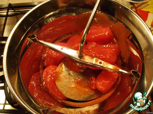 Добавить помидоры, удалив кожицу и семена, и перетерев её в "пюре".