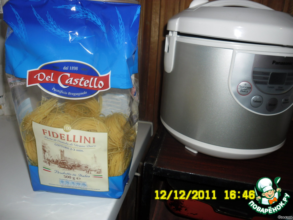 Гнезда уложить на дно мультиварки и наполнить их фаршем. Залить холодной водой до верха гнезд. Посолить воду по вкусу. Закрыть крышку мультиварки и включить режим "Плов".