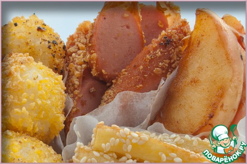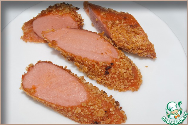 Сосиску обвалять в панировке и обжарить немного в масле. Готовую сосиску разрезать на дольки.