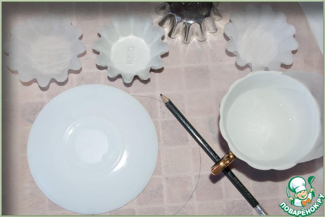 Пергамент складываем, обрисовываем и вырезаем кружочки. Затем их держим недолго в воде, чтобы стали мягкими, и вкладываем в железные формочки, разравнивая. Можно сложить стопочкой по 3-4 кружочка.