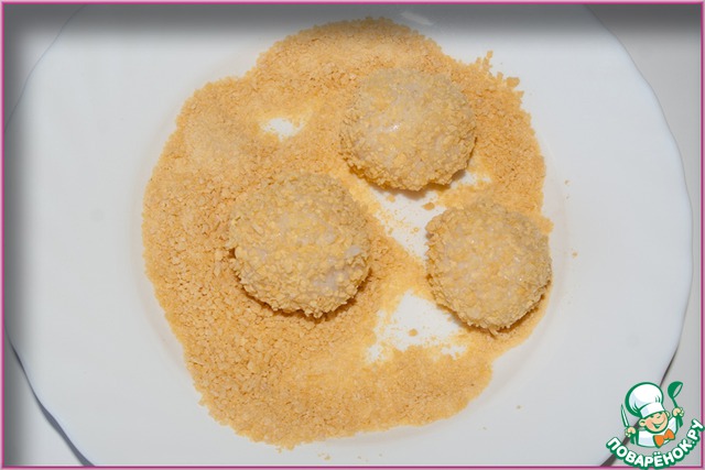 Из остывшего риса скатайте шарики, обваляйте в панировочных сухарях (я для панировки перемалываю в комбайне кукурузные хлопья). Обжарьте шарики в горячем масле.