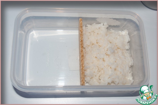 В Японии для бэнто используют специальные ланч-боксы. Вы можете взять обыкновенный контейнер для продуктов (для разогрева в микроволновой печи, например). Разделяем перегородкой контейнер на 2 части (я взяла вафельный хлебец), выкладываем на 1 половинку рис.