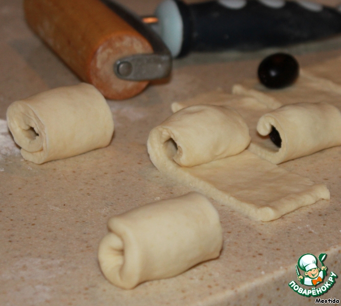 На один конец полоски выкладываем маслину и сворачиваем рулетик.