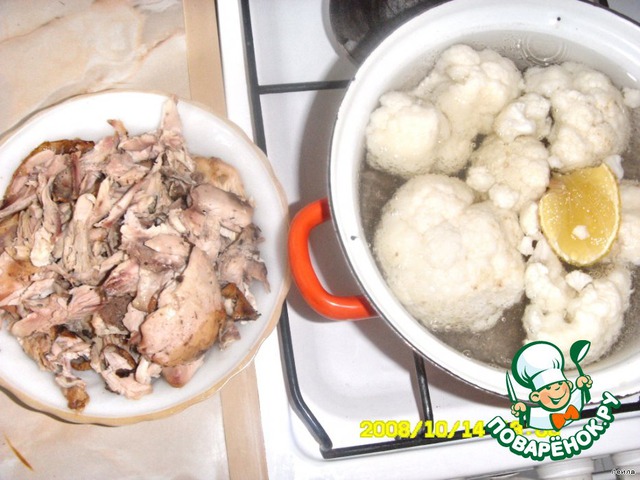 а так конечно курицу отварить, отделить мясо от курицы, отварить цветную капусту в подсоленной воде, добавить ломтик лимона, после добавить нарезанную морковь.