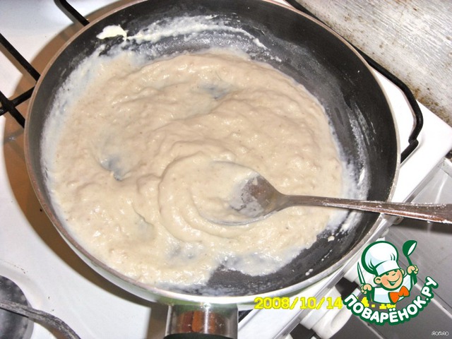 Дать чуток остыть и влить тёплое молоко, быстро размешать, чтобы не было комочков.