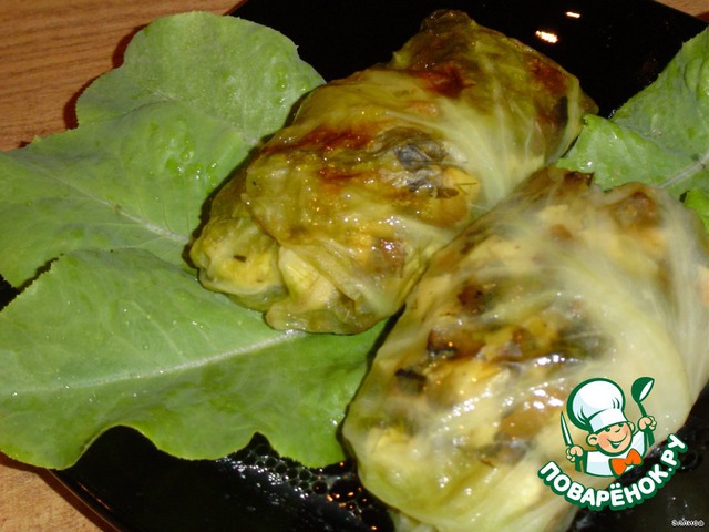 | Готовила это блюдо для дочки и очень хотелось сделать что-то необычное. Курочка, грибы, брынза, сметана - и все это завернутое в капустные листья... Дочка была в восторге! Попробуйте, может и вам понравится это блюдо!!! |
