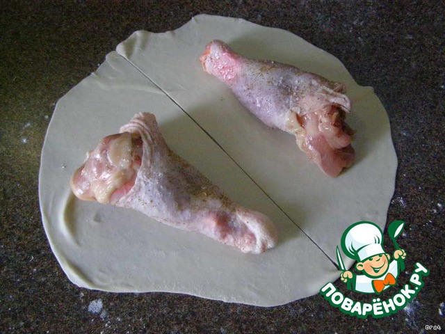 Значит так, настоящая космическая еда не допускает никаких косточек, поэтому вынимаем косточки из голяшек (окорочков), солим их и перчим. В каждую голяшку вместо кости вставляем крабовую палочку (палочки неплохо некоторое время подержать в соевом соусе, чтобы не были сладковатыми, но не обязательно). Делаем (или берем готовое) тесто - у меня это просто горсть муки, немного воды и щепотка соли.
