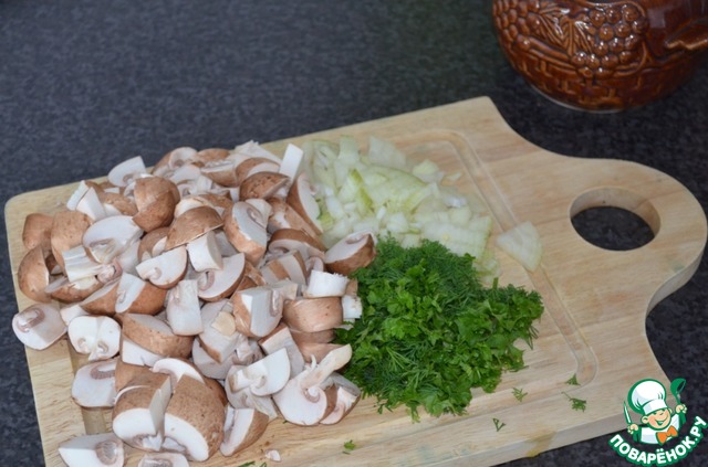 Порезать репчатый лук, свежие грибочки, свежую зелень (укроп и петрушку).