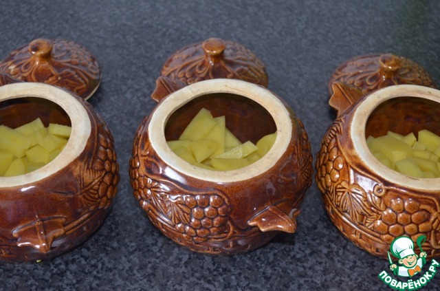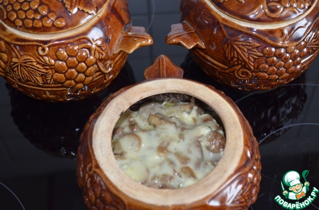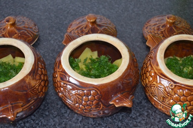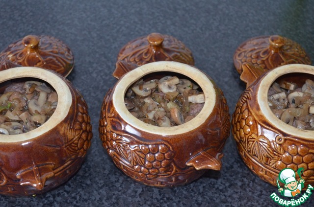 Горшочки накрыть крышечкой и поставить в холодную духовку (чтобы они не лопнули). Включить духовку на 200 градусов, готовить примерно около часа!