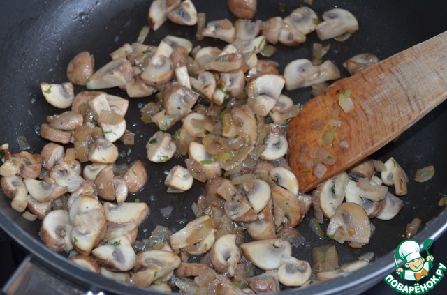 Обжарить на сковороде, в маленьком количестве масла, порезанный, репчатый лук и грибочки.