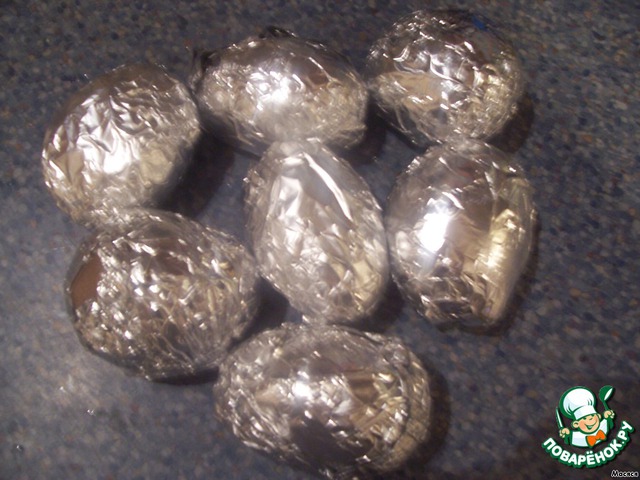 Каждую картофелину плотно обернуть в фольгу. Поставить в разогретую духовку на 30 минут приблизительно, до полуготовности.