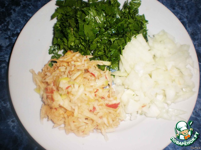 Яблоко натереть на крупной терке,не трогая сердцевину.Лук очистить и измельчить.Петрушку вымыть и мелко нарезать.