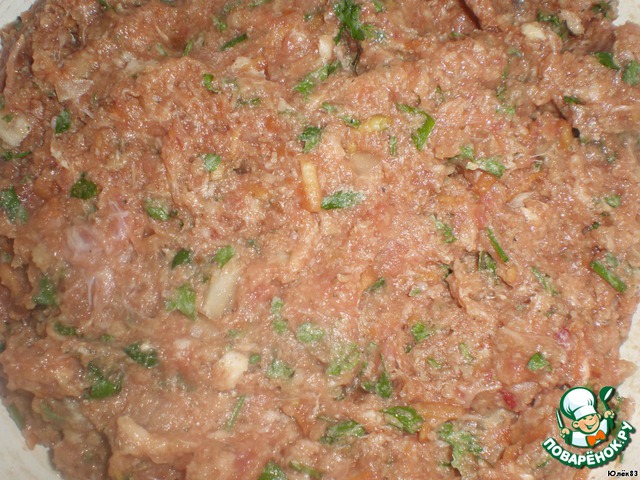 Добавить в фарш хлеб вместе с молоком, лук, яблоко, мяту, яйца. Посолить, поперчить.