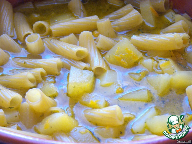 Добавим пасту, бульон или воду. Хорошо перемешаем всё и оставим тушиться на медленном огне, иногда помешивая, на 2 минуты больше того времени, которое написано на упаковке пасты.