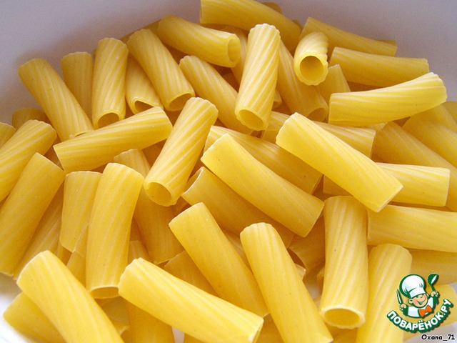 В такой соус хорошо подходит короткая паста. Я взяла "Ригатони". Она имеет форму трубочки и наш соус хорошо заполнит "внутренности" этой пасты.