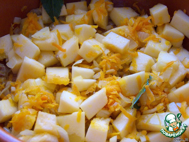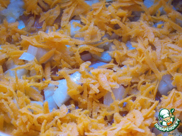 Почистим и порежем мелко лук и морковь (я её натёрла на тёрке). Обжарим всё на растительном масле в глубокой посуде.