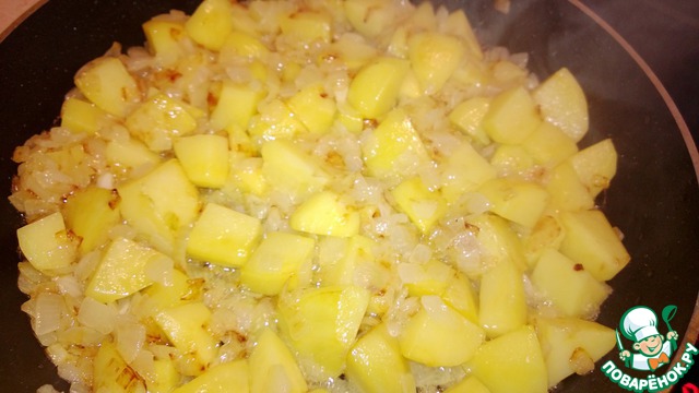 Лук мелко нарезать кубиками. Картофель очистить нарезать кубиками 2*2 см. и обжарить на оливковом масле до золотистого цвета.