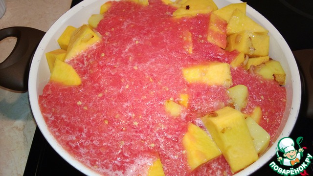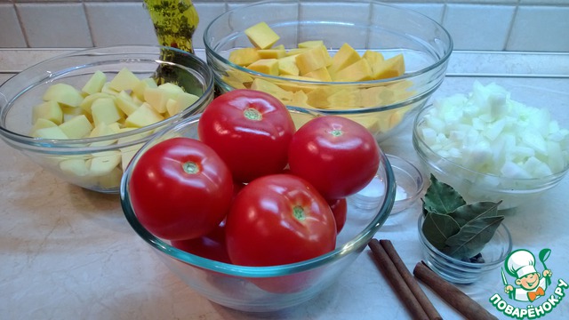 Переложить картошку и лук в сотейник. Добавить тыкву порезанную на кусочки размером 3*3. и томатное пюре.