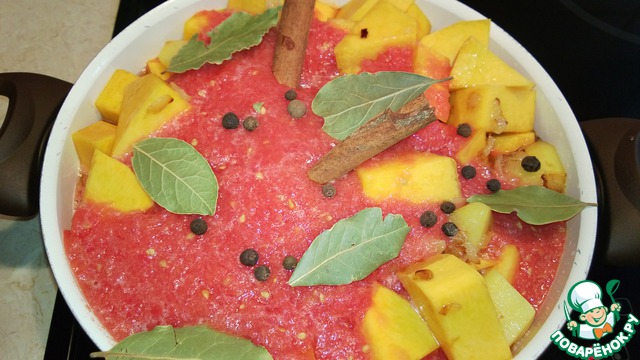 Добавить корицу, душистый горошек, лавровый лист, сахар и соль. Перемешать.