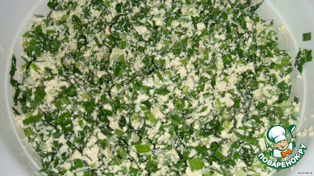 К творогу добавить дикий лук, соль, перец и хорошенько перемешать