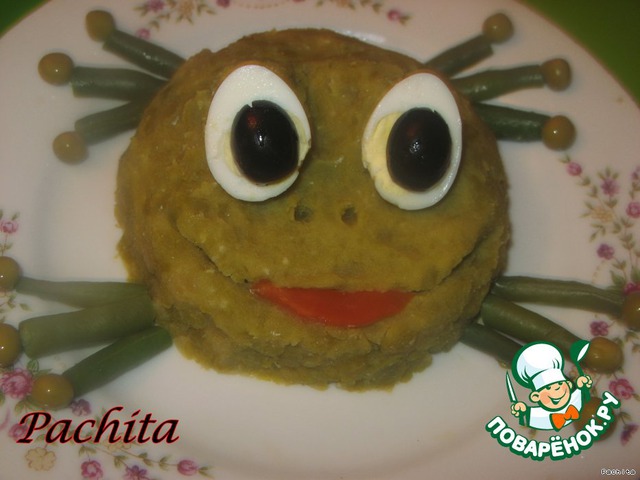 | У меня есть небольшая брошюрка , где доча увидела похожую "лягушку". Вот я наконец - то приобрела зеленый горох и решила еe порадовать. Результатом делюсь с вами. Радуйте своих детишек и себя!!! |