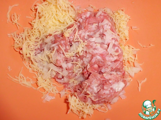 В фарш добавляем нарезанный лук и натертый сыр (самая маленькая терка). Солим и все перемешиваем. Обычно, при приготовлении пельменей, я добавляю в фарш воду, но в этом рецепте не стала этого делать.