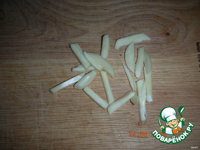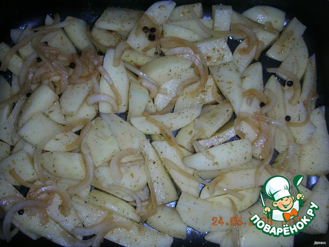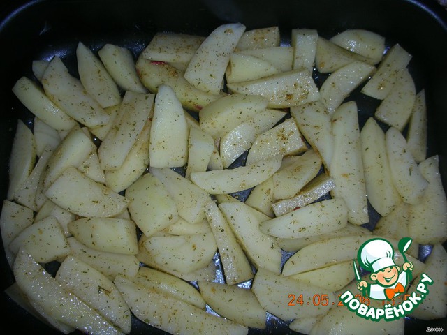 10. Чистим и нарезаем картофель, укладываем его на противень