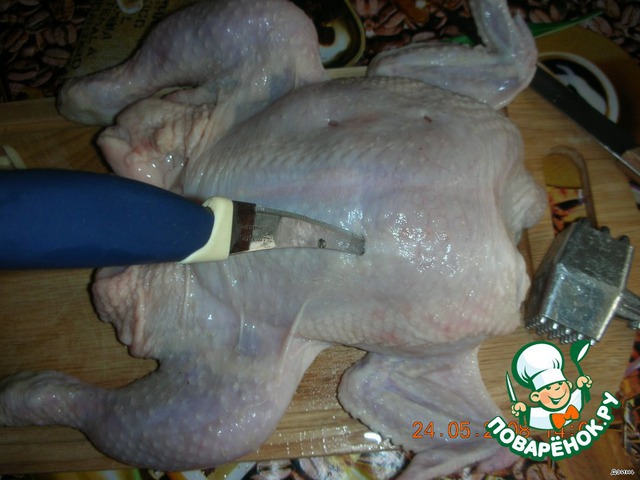 3. Острым ножом делаем проколы в курице и шпигуем ее нарезанным чесноком