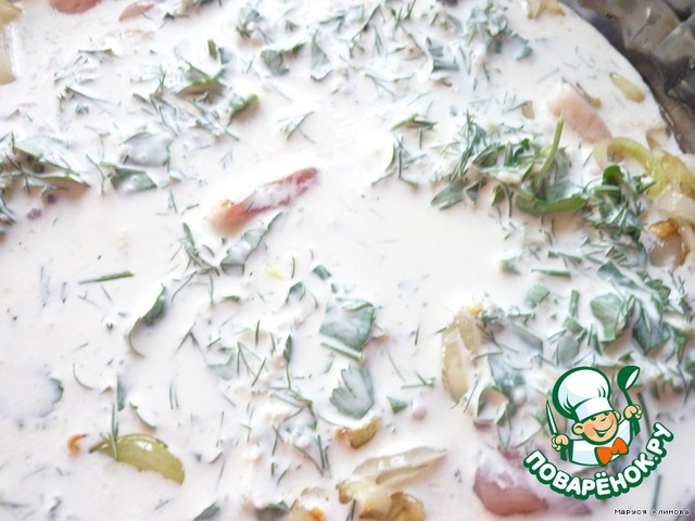 Сливки смешать с чесноком и зеленью, посолить, поперчить (перец при желании, блюдо за счет чеснока будет достаточно острым).