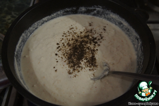 Выложить пассеровку в соус, добавить соль и перец по вкусу и потушить до густоты сметаны.