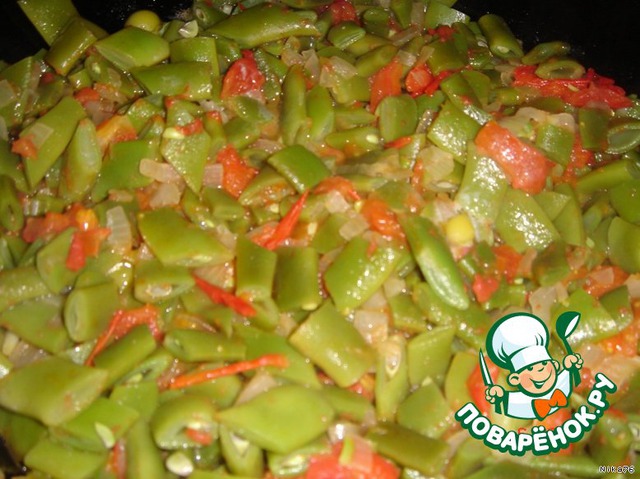 Добавить лобио в сковороду к помидорам. Обжарить.