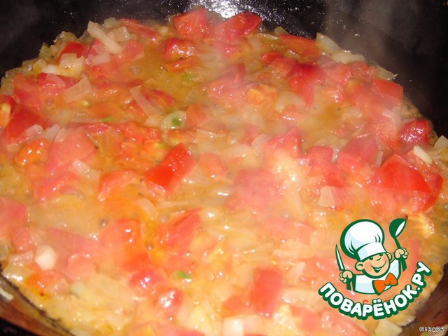 Обжарить на чугунной сковородке лук, затем добавить помидоры.