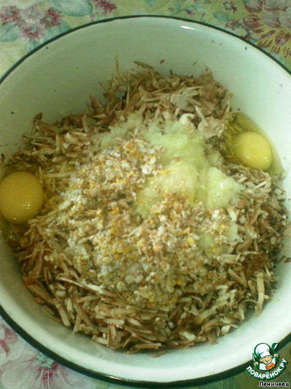 Приступаем с садисткой операции - лук тоже тру на терке, мне кажется так сочнее. Добавляю яйцо, готовые хлопья. Фарш готов.