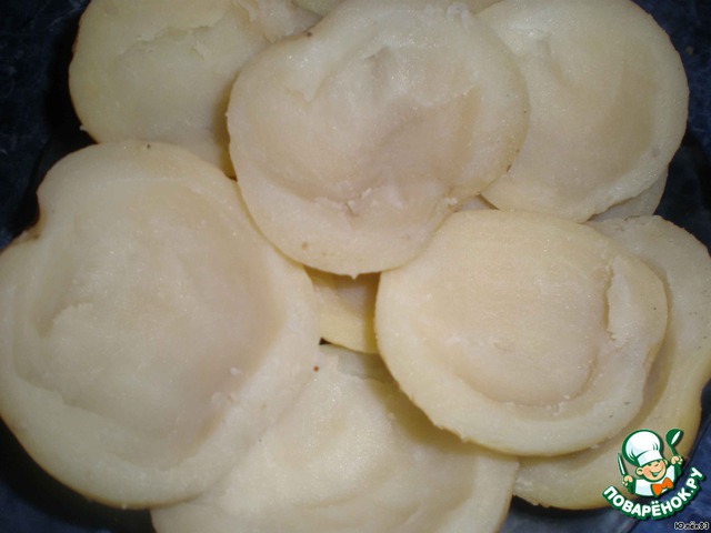 Разрезать каждую картофелину вдоль пополам и вынуть часть мякоти.