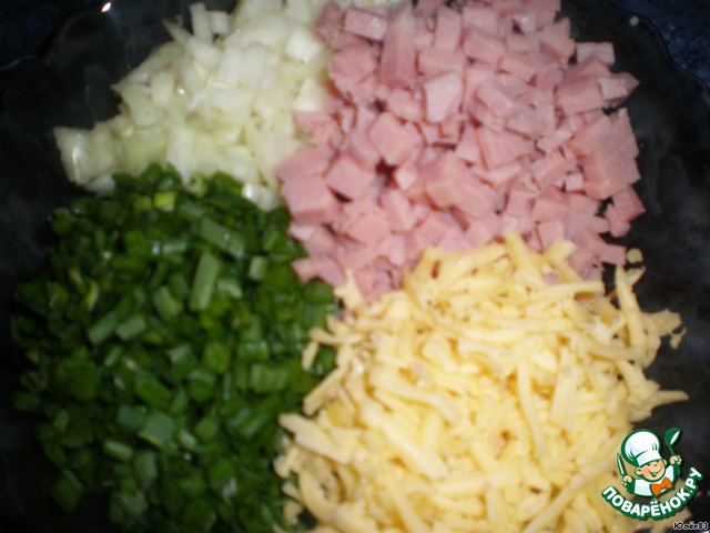 Зеленый и репчатый лук измельчить.Сыр натереть.Ветчину нарезать небольшими кубиками.