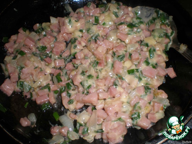 Разогреть масло,обжарить лук,добавить ветчину и готовить 3 мин.Снять с огня и добавить сыр и зеленый лук.