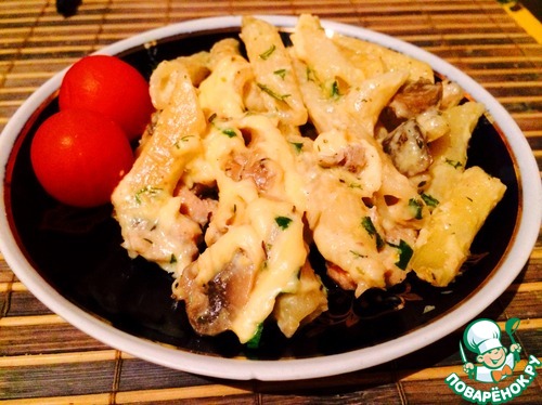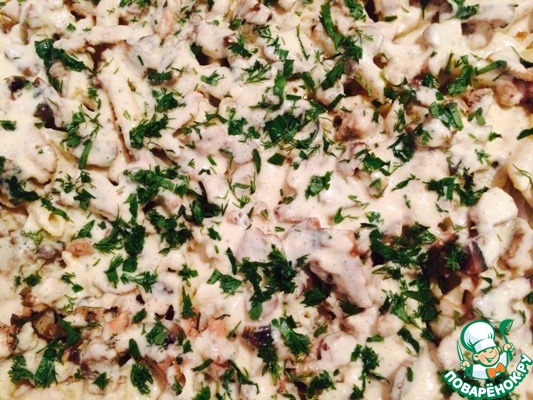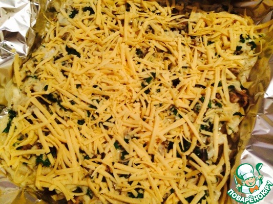 Посыпать тертым голландским сыром. Накрыть фольгой и поставить в разогретую до 220 градусов духовку на 15 минут.