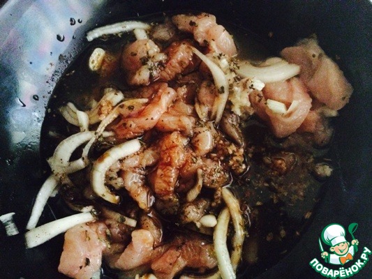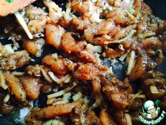 Куриное филе порезать на маленькие кусочки. Я люблю мариновать мясо. Если время не поджимает - советую поступить так же. Мариновала 1 час в соевом соусе, специях, чесноке, луке газированной воде (в соленой, натриевой. она здОрово мягчит мясо)