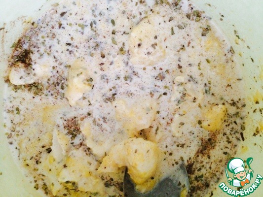 Обжарить курицу на маленьком кусочке сливочного масла. Обжаривала вместе с луком, в котором курица мариновалась. Добавить специи и зелень.