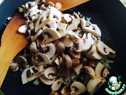 Нарезать шампиньоны пластинками, также мелко порезать лук. Обжарить минут 5 на сковороде (всегда жарю грибы без масла), чтобы влага ушла, влить соевый соус (вместо соли). Переложить грибы в тарелку.
