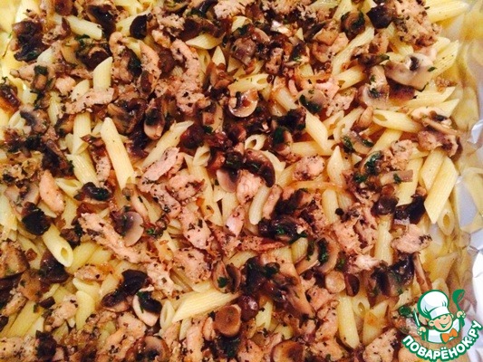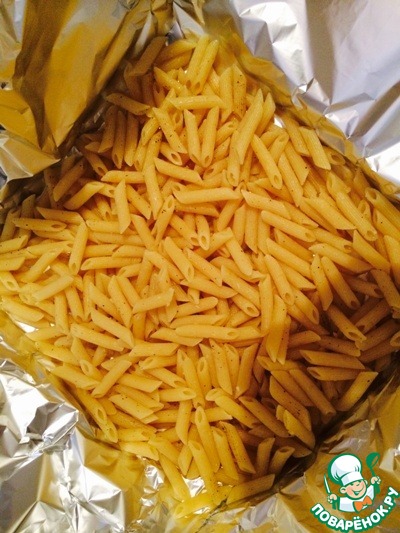 Сварить макароны в подсоленной воде до всем известного состояния "аль денте". То есть, немного недоварить. Добавить маленький кусочек сливочного масла. Переложить в форму. Я форму фольгой застелила.