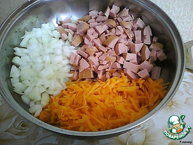 В другой сковороде жарим на растительном масле мин 10 натертую морковь, мелко порезанный лук и сардельки кубиками.