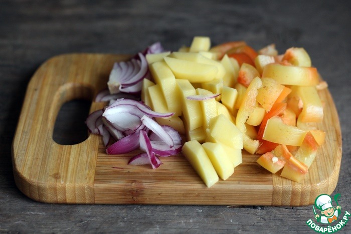 Лук нарезать полукольцами или чуть мельче. Картофель и перец почистить и не крупно нарезать, мне нравится продолговатыми брусочками.